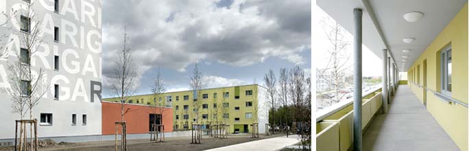 Für das „Wohnen mit Service“ wurden überwiegend kleinere Wohnungen, als im Bestand vorhanden, benötigt. Aus diesem Grund sieht die Konzeption einen Wechsel der Erschließung vor: Die größere Wohnungen werden im EG-2.OG über einen Laubengang und die kleinere, südorientierten Einheiten im 3-5.OG über einen ‚Mittelgang‘ erschlossen.