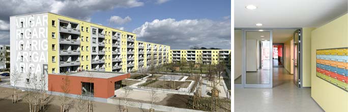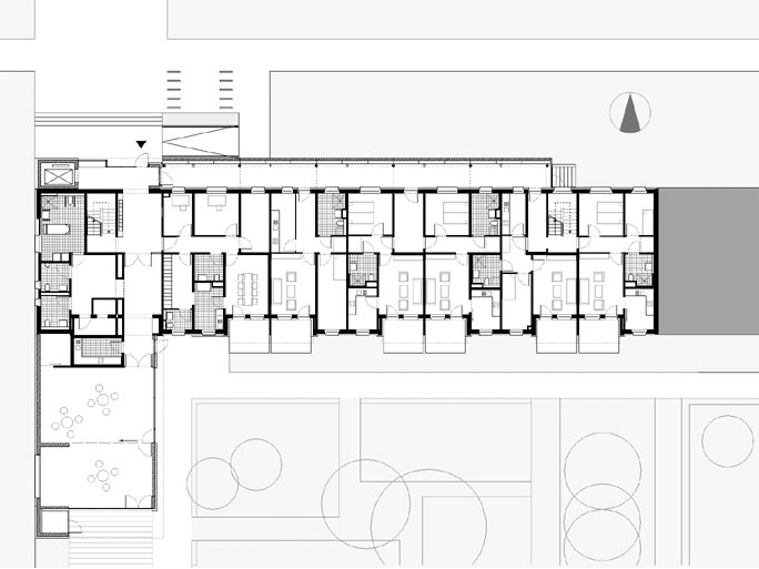 Für das „Wohnen mit Service“ wurden überwiegend kleinere Wohnungen, als im Bestand vorhanden, benötigt. Aus diesem Grund sieht die Konzeption einen Wechsel der Erschließung vor: Die größere Wohnungen werden im EG – 2.OG über einen Laubengang und die kleinere, südorientierten Einheiten im 3 – 5.OG über einen ‚Mittelgang‘ erschlossen.