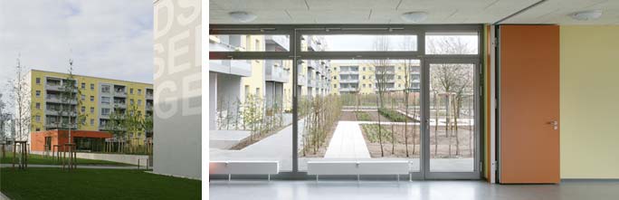 Dieser Bauabschnitt des Quartiers C4 wird geprägt durch seine zwei Anbauten: auf der Nordseite der Laubengang und die vertikale Erschließung inkl. Aufzug und auf der Südseite ein eingeschosssiger Clubraum, der vom ganzen Quartier benutzt werden kann. Mit seiner roten Farbe nimmt er das Thema der farblich akzentuierten der Haus- und Hofeingänge auf.